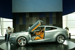 With 'kinetic design', the Ford of Europe design team has embraced the marque’s core values in an expressive, new design language. iosis expresses this language in its ultimate form. Kinetic design visualises Ford's acclaimed driving quality – it expresses energy in motion. Contributing further to these athletic, sculptural forms are the well defined wheelarch lips that have become a familiar Ford design signature since they appeared originally on the Ford Focus. Overlaid on these well defined sculptural forms are clearly recognisable graphic elements. Prominent among these is the distinctive daylight opening area with its characteristic upward tick at the rear. On iosis the new face of Ford is represented by the familiar Ford graphic of an inverted trapezoid air intake, in this case placed below a bold, chromed grille. Strongly drawn lamp graphics at front and rear are further identifiable elements with the headlamps also echoing the upward tick seen in the DLO. The precise detailing of the rear lamps and the chamfered lower corners of the rear glass combine to form another clearly identifiable graphic that defines the rear of the car. This complex surfacing and careful attention to graphic forms contributes to the tense, muscular stance of iosis. This is enhanced by precise detailing that is evident in the jewel-like featuring in the lamps and the wide, strong rocker panels. Exciting, new wheel designs with design cues drawn from the graphic elements seen elsewhere on the car are a final, vital element of the overall 'kinetic design' story. On 'iosis' this feature is expressed in a typically strong way with 20-inch wheels, milled from solid aluminium billets, featuring a contrasting polished and anodised finish that accentuates their three dimensional design. The strong sculptural forms, clearly recognisable graphic elements and fine detailing that are defined so strongly on iosis will be applied in varying ways on all future Ford of Europe models. This 'kinetic design' provides the clearly identifiable form language that will enable Ford to drive towards design leadership. Dramatic inside The interior design of iosis follows the dramatic themes of the exterior, while retaining an inviting ambience. The unique angled pivoting door arrangement gives complete, uninterrupted access to the interior, and ensures there is an instant visual link between the interior and exterior. All the sections from the instrument panel through to the centre stack and through to the console reflect the dramatic forms of the exterior. The instrument panel itself is a slim and complex form that sweeps around the front occupants of the vehicle. These forms are complemented by a selection of trim materials and colours that interprets the dynamic sporty exterior in a particularly modern way. By combining futuristic materials such as rubber and aluminium with luxurious materials, like leather, an ambience has been created that matches a technical character with sophistication. An ultra modern steering wheel fashioned from solid aluminium with contrasting orange glove leather grips and a graphite metallic leather airbag pad is matched by the Focus World Rally Car inspired sequential gear shifter. Together they embody all the themes running through the interior: contemporary craftsmanship, high quality materials and a touch of surprise-and-delight technology, with the starter button mounted beneath a flip lid on top of the shifter. The driver's cockpit is dominated by a prominent instrument binnacle housing a cluster of analogue instruments. Their chronograph precision is balanced by a high definition LCD display, reconfigurable for the navigation system or views from three rearward facing cameras. Eye-catching seats with skeletal frames featuring a ribcage and vertebrae structure are fashioned from aluminium and formed rubber. Separating the front seats is a 'flying bridge' centre console. The air vents featured on the facia and the centre console have a twist control that unfurls the vanes in a way that mimics those of a jet fighter’s afterburners. This imagery of a jet’s thrust is highlighted in the doors by aluminium inserts which flow and taper away from the vents. Neoprene is used extensively in the interior finishing in three colours: dark charcoal, "oxygen" - a metallic grey - and a strong shade of technical orange. There is also a unique leather finish that has a subtle, graphite metallic look. For the floor, conventional carpeting has been replaced with a more rugged, structured weave with technical silver highlights. Innovation iosis features a number of design innovations. The dramatic angled pivoting door arrangement features doors constructed from carbon fibre for lightness. The doors are powered by rams that swing them upwards and outwards via a system of sophisticated hinges that ensure additional support isn’t required when the doors are open. There are no conventional door mirrors on iosis. Mounted in the rear valance is a camera to complement those on each door . The exterior cameras are pieces of precisely machined aluminium, swept back to further underline the car’s visual appearance. The front lamps have an inner circular turning led for low beam with a vertical day time running light, separating it from the turn signal on the outer edge. Beneath these lighting elements are ten main beam leds, emerging when lit from tubes like a series of lasers. This look is echoed in the rear light cluster with tail lights organised in a circle with a flattened top, flanked to the outside by the indicators and inboard by the stop lights. Inside iosis, the centre stack houses docking points for a pair of memory sticks. It is possible that rather than using a conventional key or even keyless entry, a memory stick could be used that as well as acting as a security device, would also contain the driver’s personal preferences for driving position, audio settings, screen configuration, etc. Another s