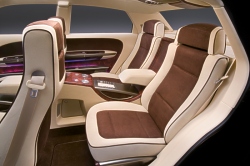 The interior is characterized by the interplay of harmonious, expressively curving shapes in which the fuller forms of the instrument panel, door armrest and map pocket elements appear to “float” above sculpted recessed cavities. Even the seats seem to float above the floor. Their elliptically-curved bronze-and-burl side shields echo similar elements recessed into the full-length floor console.