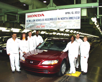 Photo: Honda TORRANCE, Calif.- Honda reached a major milestone in North America last week with its 10 millionth North American-assembled vehicle since local production began in 1982 at Honda of America Mfg. (HAM) in Marysville, Ohio, American Honda Motor Co. Inc. (AHM) announced. Honda annually manufactures and assembles more than 1 million vehicles in North America, including the Honda Accord, Civic and Odyssey, and the Acura TL, CL, MDX and EL (Canada only model). It also produces both V-6 and 4-cylinder auto engines and automatic transmissions. With a recent production increase at Honda of Canada Mfg. (HCM) in Alliston, Ontario, Canada, Honda's annual North American vehicle production capacity will increase to 1.18 million units by 2003 -- 20,000 units above the previously announced target of 1.16 million units. The production increase at HCM reflects Honda's expansion in production of light truck class vehicles -- HCM currently has exclusive worldwide responsibility for production of the Honda Odyssey minivan and the Acura MDX sport utility vehicle. In the fall of 2001, Honda will open its 11th North American plant in Lincoln, Ala., for the production and assembly of the Odyssey and V-6 engines. "Our vision in building products in North America was to be close to our customers," said Koki Hirashima, president of Honda of America Mfg. and head of production engineering and manufacturing for Honda in North America. "Increasing customer demand for our products, together with the determination and creativity of our associates and suppliers in North America, is what made it possible to produce 10 million vehicles in less than two decades." In 2000, more than 75 percent of all Honda and Acura vehicles sold in America were produced and assembled in North America. Increasingly, Honda's North American operations have taken on major responsibilities within the company's global strategy. Eight different models – the Honda Accord Coupe, Civic Coupe, Civic GX natural gas vehicle, Odyssey, and the Acura TL, CL, MDX and EL are produced exclusively in North America. "The growth in the capabilities of our operations in North America is based directly on the growth in capabilities of our associates in North America," said Hirashima. This growth has led to an expanding role within Honda's "Global Product Supply Network." American Honda has exported more than 600,000 North American-assembled automobiles to more than 90 countries. In this way, Honda's North American plants serve not only as a regional supply base, but also as part of a true global network. Honda's ongoing introduction of its flexible New Manufacturing System in North America also has helped expand the role of these plants. The key attribute of this new production system is flexibility -- both in terms of the relative ease with which multiple models can be built in a single factory and the number of different Honda plants that can build the same models. With the launch of the 2001 Civic, the New Manufacturing System was introduced at the East Liberty Plant in Ohio and the Alliston Plant in Ontario, Canada. Installation of the new system has begun at the Marysville Auto Plant in Ohio. Growing North American production has also meant increased opportunities for North American suppliers. Honda currently partners with more than 480 North American suppliers, and on a global basis purchased more than $8.77 billion in parts and materials from North American suppliers last year. Honda began manufacturing in North America in 1979, producing motorcycles at HAM in Marysville, Ohio, using domestic and globally sourced parts. HAM now employs more than 13,000 associates at four different Ohio facilities -- the Marysville Motorcycle Plant, the Marysville Auto Plant, the East Liberty Auto Plant and the Anna Engine Plant. With an annual auto production capacity of 670,000 units, HAM now produces the Accord Sedan and Coupe, Civic Sedan, Coupe and Civic GX, Acura TL and Acura CL. To date, HAM has produced almost 8 million Honda and Acura vehicles. Producing more than 1 million auto engines per year, HAM also provides engines to Honda plants in Canada, Mexico and other nations. Honda began auto production at HCM in Canada in 1986, focusing primarily on Civic production until 1998, when the Alliston plant successfully undertook a major challenge with the launch of the all-new Odyssey minivan on the plant's No. 2 production line. In fall 2000, the No. 2 line added production of the Acura MDX sport utility vehicle, at the same time increasing daily production capacity from 650 to 700 units. Last month, to meet growing consumer demand, HCM's No. 2 line increased its production capacity from 700 to 750 units per day. These production increases totaling 20,000 units at HCM's No. 2 line will boost production to 180,000 Odyssey minivans and Acura MDX sport utility vehicles per year. HCM now has an annual capacity of 350,000 units, employing 4,000 associates at its Alliston, Ontario, facility. To date, HCM has produced almost 2 million vehicles. Honda de Mexico (HDM) began assembling vehicles in 1995 and produces Accord Sedans primarily for the Mexican market using engines from Honda's Anna Engine Plant in Ohio, and support and parts from Honda's North American suppliers. To date, HDM has produced more than 46,000 units. Later this year, Honda's newest auto and engine manufacturing facility, Honda Manufacturing of Alabama (HMA) will begin production to help Honda meet growing consumer demand for light trucks and other vehicles. HMA will have an annual capacity of 120,000 vehicles and engines. When completed, HMA will increase Honda's capital investment in North America to more than $6 billion, increase North American employment to more than 25,000 associates and bring to 11 the number of major Honda manufacturing plants in North America, all using domestic and globally sourced parts. (April 16, 2001) [Homepage] [