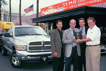 Chrysler Group officers, Rich Schaum, Executive Vice President, Product Development and Quality (left); Dieter Zetsche, President & Chief Executive Officer (2nd from left); and Jim Schroer, Executive Vice President, Global Sales and Marketing, accept the "Pickup Truck of the Year" award from Jon Thompson, Editor, Four Wheeler magazine (far right), at the 2001 Specialty Equipment Manufacturers Association Exhibition this week in Las Vegas. Auburn Hills, Mich. - The all-new 2002 Dodge Ram 1500 pickup has won Four Wheeler magazine's "Pickup Truck of the Year" award, the publication's editor announced today. During an intensive four-day competition, the Dodge Ram 1500 4x4 Quad Cab upstaged rivals in the competition. "All of us at Dodge are elated that Four Wheeler named the all-new Dodge Ram the winner of their 'Pickup Truck of the Year' competition," said Jim Julow, Vice President Dodge Division Global Brand Center, DaimlerChrysler Corporation. "We built on all the successes that made the previous-generation of our award-winning Ram such a strong force in the market. It's great to see the 2002 Dodge Ram carry on the tradition of being the biggest, best and boldest pickup out there." "Pickup trucks are the ultimate automotive commodity, so Four Wheeler is especially pleased to acknowledge the excellence of the 2002 Dodge Ram 1500 4x4," said Jon Thompson, Editor, Four Wheeler. "Because we take pickup trucks seriously, we evaluate them for all their intended functions. And while we included pickups from every manufacturer in this test, the Dodge Ram proved to be most adept at showing us all the qualities enthusiasts look for in a four-wheel-drive pickup." The magazine rates 4x4 trucks in the following categories: Interior, Exterior, Mechanical, Highway and Trail. The Dodge Ram 1500 4x4, completely redesigned for 2002, scored highly in every category. The all-new Dodge Ram boasts the option of two or four standard doors, two new Magnum® engines available, a new automatic transmission and a host of new customer convenience features. The Four Wheeler "Pickup Truck of the Year" competition will appear in the January 2002 edition of the magazine. Information about the all-new 2002 Dodge Ram pickup is available on the web at www. 4adodge.com. (Nov. 2, 2001) [Homepage] [