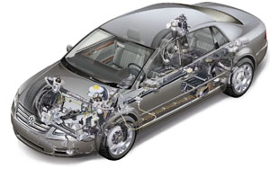 Photos: VW Volkswagen has succeeded in giving the Phaeton excellent dynamic safety and a high degree of dynamism without sacrificing ride comfort, thanks to the standard air springs in combination with four-link front suspension and trapezoidal-link rear suspension. The chassis development engineers' aim was to create a suspension system that satisfies the highest standards of both journey comfort and road dynamics. Air suspension with controlled damping is ideal for the purpose, with many advantages not possessed by a conventional system with steel springs. The air suspension's ride height control function, which maintains a constant body height regardless of load, enables the springs to be given softer ratings for maximum comfort and also permits the cars body to be lowered by a specific amount at high speeds; this also has the effect of reducing fuel consumption. Air suspension also makes the car ride and handle better on poor surfaces. The physical characteristics of air suspension enable the spring rate and the vehicle's static ride height to be varied automatically in accordance with the load being carried: this is the classic self-levelling function associated with air suspension, and ensures that the occupants enjoy an equally comfortable ride regardless of the total load. In addition, the vehicle's dynamic characteristics vary less when it is heavily laden. Since the damping action is also continuously variable, ride comfort and driving safety are both significantly improved, and even the most extreme handling situations can be mastered more effectively with the aid of changes to the damping characteristics. The air suspension itself consists in detail of the following basic elements: four air suspension struts, one at each wheel, the air supply pump unit, a pressure reservoir, a control unit, four level sensors at the front and rear axles, three acceleration sensors on the car's body and another four mounted on the suspension elements. The key elements in the system are the four air spring modules. The externally located bellows are specially shaped for smooth initial response whenever wheel movement occurs. The desired low spring rate is assured by providing additional reservoir volume and by special shaping of the pistons, which has a positive effect on the air spring's dynamic behaviour. In addition, the damping force exerted at each wheel can be varied within a few thousandths of a second to match actual needs by an electric control valve integrated into the piston of each hydraulic shock absorber. The optimum damping force, which depends on the car's direction and stability, is determined among other factors by the signals from wheel acceleration sensors mounted on the shock absorbers themselves, and three acceleration sensors on the car's body. This 'intelligent' technical system makes this large luxury saloon exceptionally agile in its handling despite the high level of journey comfort which it provides. The electronically controlled shock absorbers identify the driving situation and vary the damping characteristic over a specific range, in accordance with a mapped characteristic. If the Phaeton is being driven in a highly dynamic manner, firmer shock absorber settings are adopted. This reduces body roll and shifts the Phaeton's road behaviour towards a more sporting style of driving. If on the other hand, the car is driven in a relaxed manner on largely straight roads, the shock absorbers are given softer settings for maximum ride comfort. These changes take place steplessly and within a fraction of a second. Thanks to this air suspension and dynamic damping system, the suspension settings retain the car's dynamics without any reduction in the occupants' ride comfort. The suspension strut support mounts are designed located in such a way that no lateral forces reach the shock absorbers. This makes their initial response more sensitive and contributes to the Phaeton's exceptional ride quality. Three body ride heights can be selected for the Phaeton: Normal (NN), Raised (HN, 25 mm higher than NN) and Low (TN, 15 mm below NN). The low level is selected automatically according to the car's road speed (above 140 km/h), so that its dynamic road behaviour and fuel consumption are optimised. The driver can also select suspension settings manually: the NN and HN positions and four shock absorber settings (Comfort, Basic, Sport and Sport 2) are available. Damping control makes use of the 'skyhook' principle, the general aims of which are to minimise body movements, guarantee a constant ride height regardless of road conditions and thus ensure both optimum occupant comfort and maximum tyre grip. This combination of the 4MOTION all-wheel drive and air suspension with electronic damping control represents state of the art technology in this area - and therefore reflects the principle adopted for every aspect of the Phaeton concept. (Nov. 1, 2002) [Homepage] [
