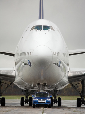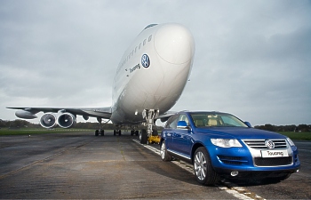 The Touareg is innately the ideal towing vehicle: Maximum load capacities are 3,500 kilos for trailers and 1,640 kilos for the rear axle. But when instead of a 3.5 ton boat trailer a jet weighing over 155 tons – consisting of 511 m2 of wing surface, 4 engines, 450 seats and a fuselage the size of a block of houses – is attached to the hitch, things look quite a bit different. Careful preparations must be made. In order for the Touareg V10 TDI to be able to tow the big bird, the weight of the Volkswagen had to first be increased. This sounds paradoxical but is absolutely necessary so that the power of the engine can be converted into propelling force. For this purpose steel balls and steel plates were distributed in the SUV. Extra weight: 4,345 kilos! Total weight of the Touareg: 7,030 kilos. Weight distribution: 2,755 kilos in front, 4,275 kilos in back. The other modifications were kept to a minimum. For the front axle drive the shorter transmission of the Touareg V8 was integrated in place of the V10 TDI transmission. The crew increased air pressure in the standard Michelin tires to 4.5 bar. And finally, the maximum speed was limited – not out of fear that the unusual harnessed system would become airborne, but to protect the tires. Everything else, from the engine to the shock suspension system and four-wheel drive corresponded exactly to the series production version. An extra device was then used to hook up the Boeing 747 to the Touareg’s standard trailer hitch. The experiment could begin. Based on the maximum torque of the V10 TDI (750 Nm) and the transmission ratio, the engineers had previously calculated that the Touareg would be able to put approx. 200 tons into motion. But who would trust his calculations if a 1.7 meter high, 4.75 meter long car was suddenly attached to a 19.4 meter high jet over 70 meters long? Nobody would. Especially not when typical English weather with heavy rain and headwinds were lashing across the car and jet as if there was no tomorrow. But the Touareg did the job. Volkswagen technician Uwe Krieghoff took the wheel. He started the engine. Using the four-wheel drive control on the middle console he selected the "LOW" setting for reduced off-road speed. 50 percent of driving force was now distributed to the front axle and 50 percent to the back. Krieghoff manually selected the second gear of the automatic transmission, accelerated slowly and reflected on getting the 18 head-height wheels of the 155 ton 747 rolling from a standing position. The greatest power was required in these few seconds. As soon as this harnessed system got moving, it would move. But the only thing that budged at first was the engine speed. Krieghoff continued to push down the gas pedal to about the halfway position. And with not a hint of traction problems the Touareg and the jumbo jet started moving. After a distance of 150 meters Krieghoff slowed the harnessed system to a stop. A post check-up of the Touareg did not find any evidence of damage to the car. Everything was A-OK. Incidentally, the new generation of the Touareg is now available for order. The SUV comes standard equipped with ESP plus trailer stabilization. It is extremely effective at preventing trailers from dangerously fishtailing when improperly loaded or traveling at excessively high speed. The system didn’t kick in during the test with the 747 – the speed was only eight km/h. (November 24, 2006)