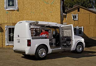 A two-person tent – accessed from outside the NV200 – is housed at the base of the B-pillar behind the driver's door, while fillers for fuel and water are housed within the opposite B-pillar. The driver and passenger doors open conventionally, while access to the workspace is via a single sliding door on the passenger side. Underwater and organic references can be found all over Nissan NV200. The purpose-made 20-inch alloy wheels have six “arms” that appear to grip the tires “octopus-fashion.” The tread pattern on the large Goodyear tires – also specially created for NV200 – incorporates “octopus suckers” onto trainer-style soles. Inspiration for the translucent ribs of the wraparound grille came from the layers of an onion. Liberal use of warning signs and instructions found on the exterior of the NV200 were borrowed from the practical graphics found on diving equipment. The exterior has a scratch resistant matt satin finish in a steel gray color to emphasize the “toolbox” nature of the project. Inspired Interior Details The NV200’s cockpit area combines form and function. The skeletal aluminum seat frames are covered in a washable contoured material similar to the fabric used in sports shoes, with a 3D texture for extra grip. Large open storage areas run the width of the van beneath the instrument panel and control cluster. Sensors within the storage zones detect movement and illuminate the entire area as soon as a hand or an object is placed in or near the shelves. Above the front seats is a glass panel incorporating a wave pattern. It bathes the interior in a diffused light, while any outside movement casts shadows in the cabin that resemble life underwater. On either side of the panel are two forward-facing glazed holders into which high-powered professional underwater flashlights can be slotted. When parked, the lights provide a floodlit area ahead of NV200. The area usually reserved for the rearview mirror holds a small color TV monitor. A rear-facing camera – a familiar Nissan feature that up until now has been used as solely a reversing aid – projects the view behind the van to the monitor at all times. Other features include a laptop computer housed in a shockproof briefcase made from rugged ribbed plastic. When not in use, the laptop docks into a side of the van beneath the worktable. A magnetic clipboard is attached to the opposite wall of the workspace, while moveable storage boxes are mounted in all three doors. Natural light for the work surface comes from a small side window above the bank of screens and from a large domed skylight in the roof of the van. In tropical climates, the skylight can be diffused to prevent a build up of heat within the interior. The end of the pod facing the inside of the van forms a bulkhead behind the front seats when the pod is not deployed and incorporates a hanging space for dry clothes. It also houses a small refrigerator, drop down sink unit and first aid kit. The NV200's tanks hold enough water to supply a shower, fitted on the outside of the pod, to allow diving equipment to be washed after use. Power for the computer, shower, refrigerator and other electrical fixtures comes from a small generator housed within the van. This, in turn, is charged by solar panels situated on the roof of the pod. Most of the materials, textures and colors used throughout NV200 reflect the materials, textures and colors used in the diving world. Interior materials are either hardened lightweight plastics or rubberized fabrics finished in a dark gray with acid yellow highlights. The glass is also tinted yellow. Perhaps the only area not directly influenced by the ocean is the wooden floor of NV200. This is finished in durable but entirely natural ebony, bringing an added touch of warmth to an otherwise serious working environment. Although the NV200 has been designed to suit the specific needs of one profession, the principle behind the concept has wide ranging potential. The design team also identified mobile libraries, Farmers’ Market vendors, florists and even field ambulances among other possible applications of the pod concept. The NV200 also features an environmentally friendly clean diesel engine. It is equipped with a number of safety systems based on Nissan's Safety Shield concept, including RearView Monitor and Distance Control Assist System. “Although the Nissan NV200 might, at first glance, appear to be a flight of fancy, the more you study its potential the more you realize it is an entirely practical and feasible project,” said Nakamura. “Nissan prides itself on designing its cars to fulfill the needs and requirements of its customers. For NV200, we have taken that guiding principle quite literally and created a vehicle for one specific user. But it is a totally adaptable and flexible concept that could have applications in a number of areas of the market.” The Nissan NV200 Concept originally debuted at the Tokyo Motor Show and has also been displayed at motor shows in Europe. Photos: Nissan (Dec 04, 2008)