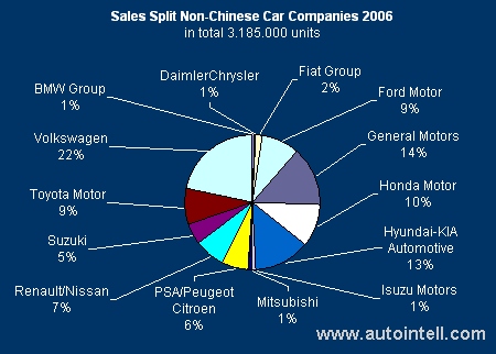 In 2006 Volkswagen was the strongest foreign car maker in China. Its early engagement of 1982 paid off. General Motors and Hyundai-Kia established a significant market share. Hyundai recently (August 07) announced its plans to increase car sales to 600.000 units by 2008. Daimler and Chrysler still have a weak footprint in the market, which might change once Chrysler is finding its new identity.
