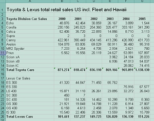 Camry became the best-selling car in America for the fourth year in a row and eighth time in the past nine years. Lexus retained its crown as the best-selling luxury brand in America for the sixth consecutive year, selling a total of 302,895 units in 2005. With overall sales of 156,485 units, Scion was a significant contributor to the record sales year. Get data in EXCEL format (EXCEL 2003) Historical figures (incl. Lexus) also contained in the EXCEL file: