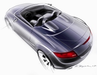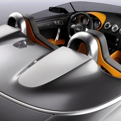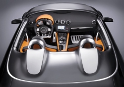 The flat, slightly tinted window strip surrounds the cockpit. The panoramic windscreen and the two humps located behind the interior in place of the hood compartment are reminiscent of a racing car. The rollover bars familiar from the TT Roadster are kept flatter and are the same height as the sports bucket seats.