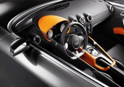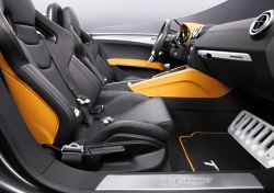 The sill area has also been restyled compared with the production model. Rather than being interrupted by a sill strip, it now emphasises the width of the car. A new door sill trim located further inside the car, along with floor mats sporting the TT logo as an aluminium inlay provide further visual highlights. The surrounding strip on the top shoulder is also made of this lightweight metal.