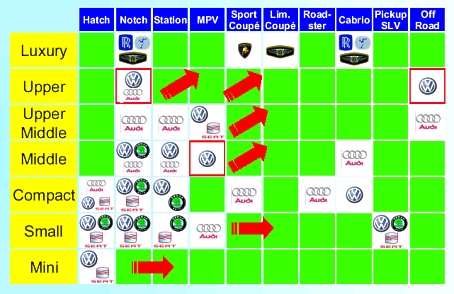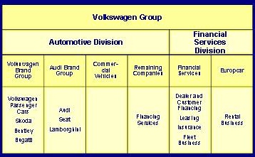 In 2003 Volkswagen introduced a new group structure. The group now consists of the automotive division and the financial services division. Brands are clustered into brand groups. Audi represents the more emotional and sporty part while the Volkswagen brand keeps on tradition.