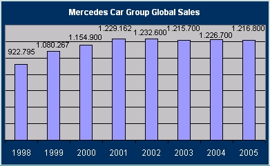 Mercedes-Benz has achieved excellent results with the second generation of the A-Class: In the first full year of sales, deliveries of A Class vehicles rose by 37 percent to 194,100 units, making the highly versatile series from Mercedes-Benz by far the number one model in the premium compact segment. The new M-Class also recorded sharp sales growth last year, with all major markets contributing to a 15 percent increase in sales to 80,400 units in 2005. At 5,100 units (2004: 6,700), sales of the Mercedes-Benz G-Class — the classic among all-terrain vehicles — remained high 26 years after production began. Demand is also growing for the two sports tourers that Mercedes-Benz launched last year as a completely new vehicle concept. A total of 57,200 customers have already purchased the B-Class, which was introduced to the European market in June. Sales of R-Class vehicles have been increasing continually since that model was launched on the U.S. market approximately three months ago. Additional sales potential is expected to be generated in 2006 by the European market launch of short- and long-wheelbase versions and diesel variants. Mercedes-AMG, which builds exclusive high-performance automobiles, remained very successful in 2005 as well, delivering more than 20,000 AMG vehicles once again, half of which were sold in the U.S. In 2005, the Mercedes-Benz SLR McLaren established itself among sports car enthusiasts around the world as a fascinating synthesis that combines cutting-edge innovation with the mystique of an automotive legend. More than 500 units were delivered to customers during the super sports car’s first full year of production. Download Mercedes Car Group global sales figures 1998 - 2006 in Excel format (EXCEL 2003) for free Source: DaimlerChrysler
