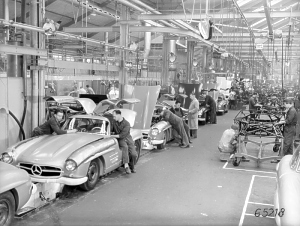 Although there were initially no plans to send the 300 SL into series production, the Daimler-Benz Board had been left with the words of Maximilian (“Maxi”) Hoffman ringing in their ears. The official importer of Mercedes-Benz cars into America campaigned tirelessly for a sports car to offer his well-heeled clientele, and the 300 SL racer fitted the bill perfectly. After lengthy deliberations, the green light was given for series production of the road-trim 300 SL (W 198), as well as a smaller, open-top sports car, the 190 SL (W 121). The two models were due to celebrate their premieres less than six months after the Board had granted the project their approval.