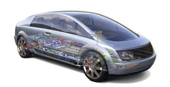 "All of the touring sedan's propulsion and control systems are contained within an 11-inch-thick skateboard-like chassis, maximizing the interior space for five occupants and their cargo. (see AUTOnomy Concept) There is no engine to see over, no pedals to operate - merely a single unit called X-drive that is easily set to either a left or right driving position." Hy-wire is the product of global cooperation.