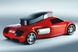 The genX is designed as an individual two-seater sports car of the next generation. Besides its sportive attributes the two-seater also comes with an adequate sleeping berth. By means of an electrical lifting roof the interior of the genX can be accordingly enlarged. The modular, external carriage boxes that are attached in the slender waistline of the genX are available for the individual use. The boxes can be released and easily carried along as suitcases. |